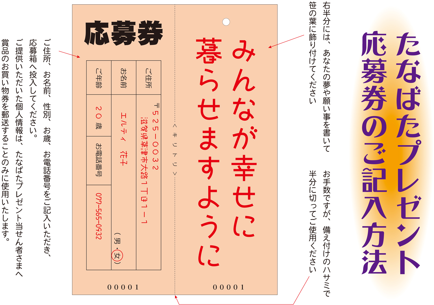 お願い事を書いた右の用紙は笹飾りに取り付けていただき、左側の応募用紙は、応募箱へ投入してください。
