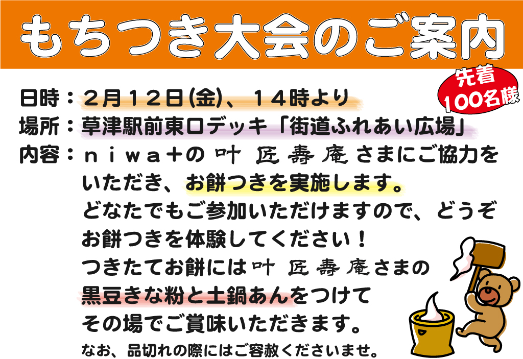 2月12日(金)14時より、草津駅前東口デッキ「街道ふれあい広場」にて、niwa+の叶匠壽庵さまのご協力を得て、もちつき大会を開催します!